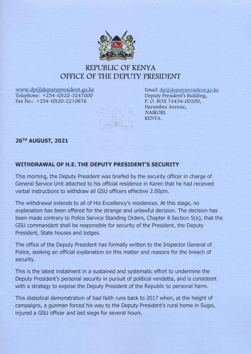Ruto Security Withdrawn - Ruto S Office Issues Statement On Security Withdrawal Kenyans Co Ke : It is allegedly said that the gsu officers who have been protecting ruto's official residence in karen, sugoi and elgonview homes;. The office of deputy president william ruto on thursday evening, august 26, released a statement regarding the changes made in his security detail. Gsu officers form part of the presidential security team. The withdrawal of security from william samoei ruto residences is a classic example of misuse of power and the archaic politics of intolerance and arm twisting. However, the withdrawal of ruto's security underscores the possibility of a possible impending arrest. The security personnel who were handling his security matters were notified to vacate all premises owned or occupied by ruto by 2 pm today 26/8/2021.